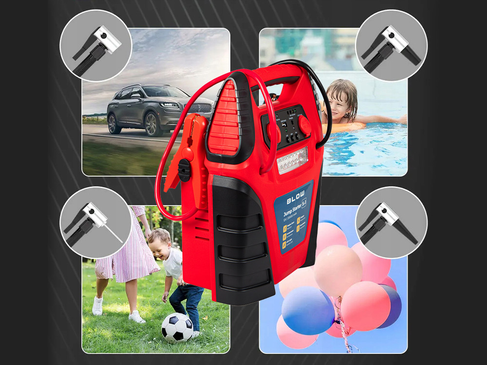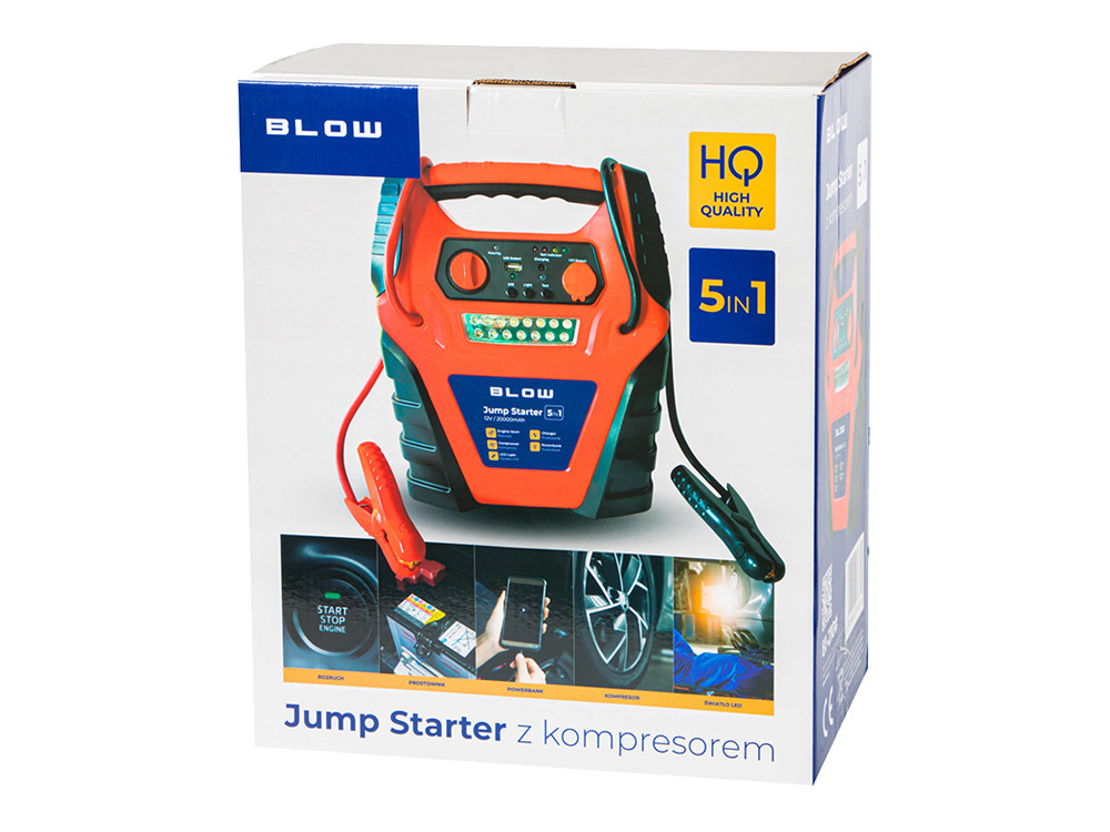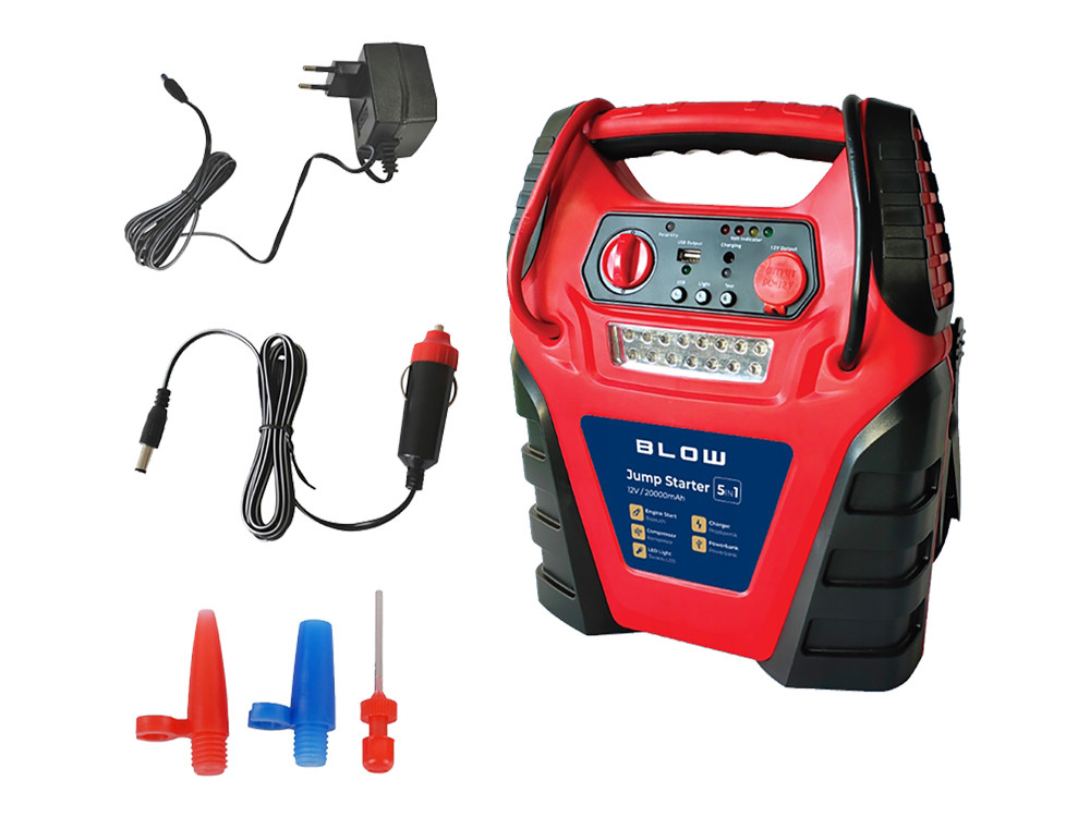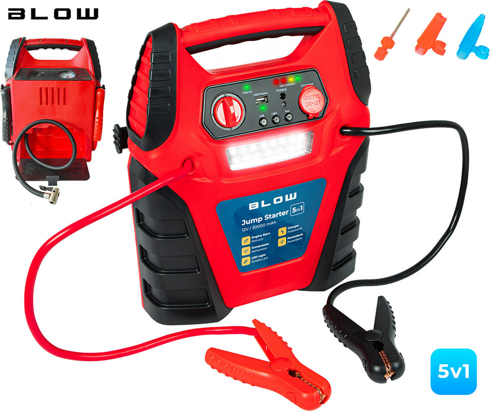 BLOW JS-5V1 zagonska baterija / jump starter s kompresorjem, 5V1, 20.000mAh, powerbank, LED svetilka, kontrolna plošča, USB-A, DC 12V, 300PSI / 20BAR