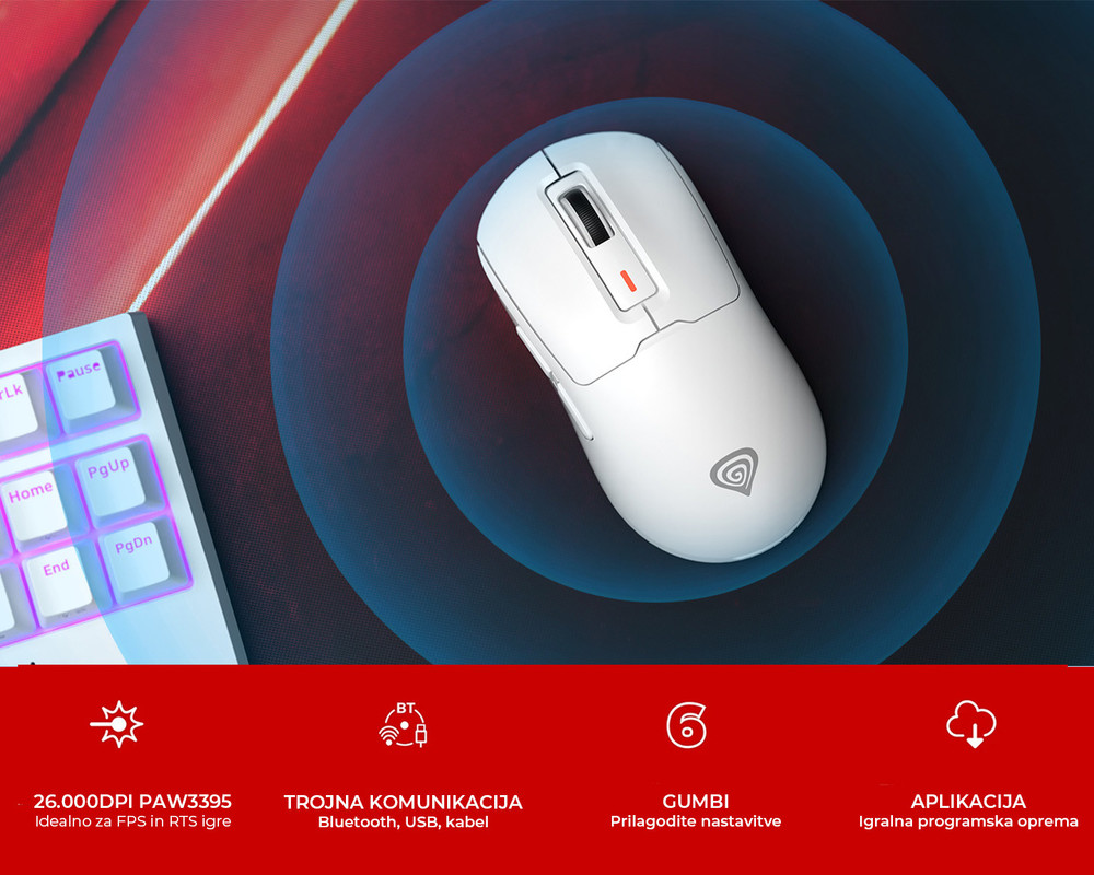 • Občutljivost do 26.000 DPI – najboljši optični senzor Pixart PAW3395.