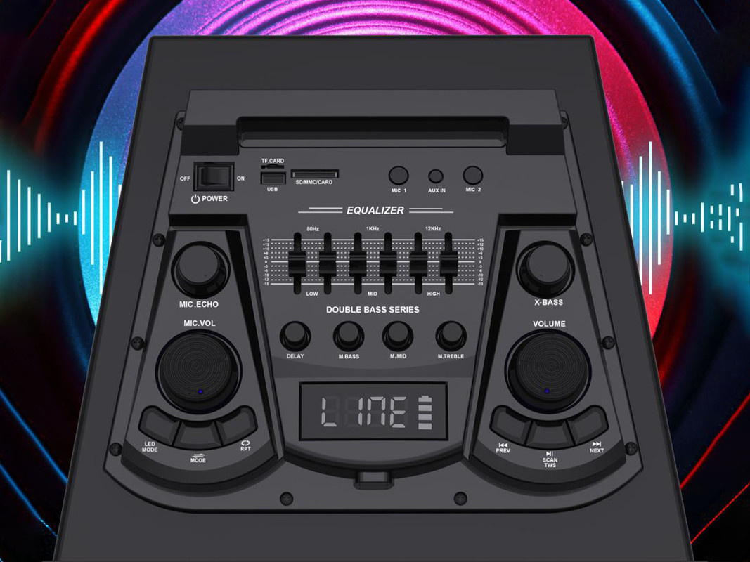 • KARAOKE doživetje – V kompletu zvočnika je priložen brezžični mikrofon, ki bo poskrbel za pravo KARAOKE zabavo. Dodatno se na zvočniku se nahajajo tudi vhodi 2x MIC-in za priklop mikrofonov, vhod USB Type-A, ter vhod microSD.