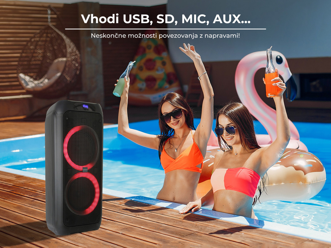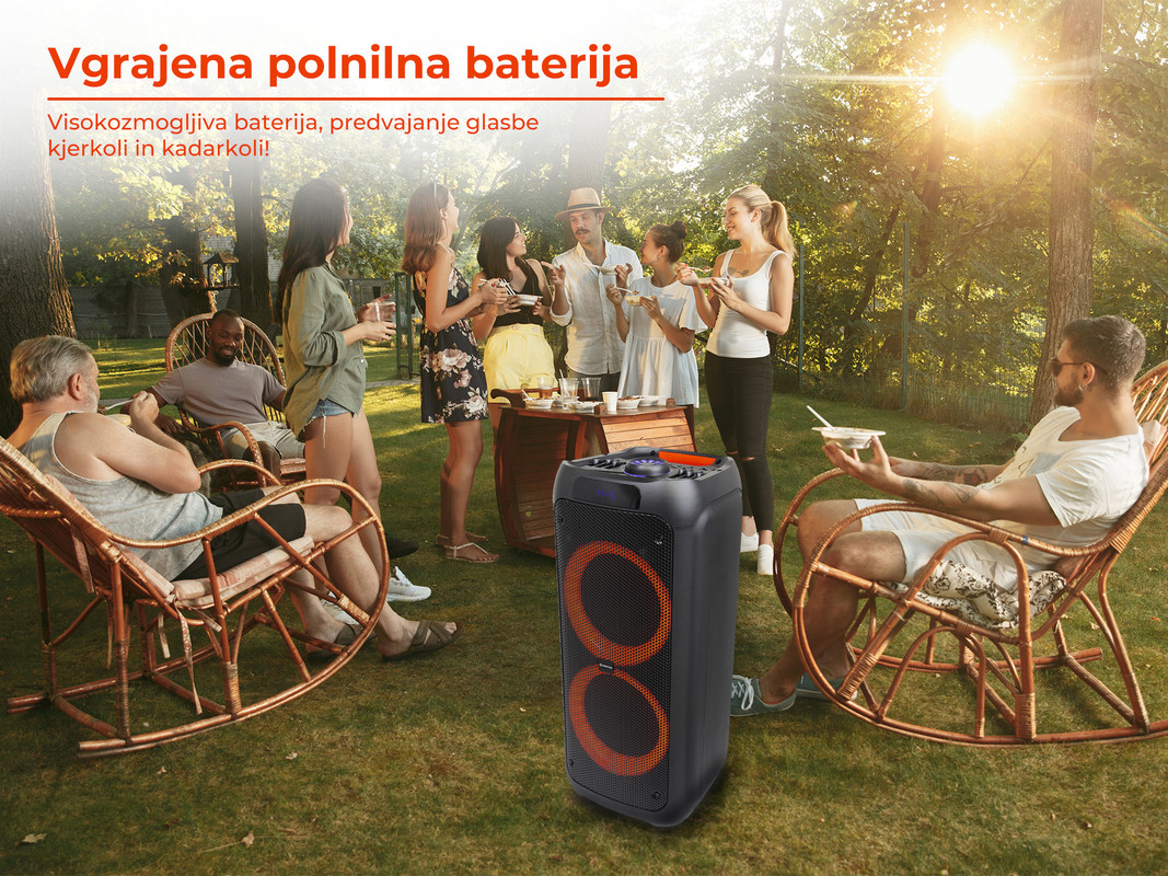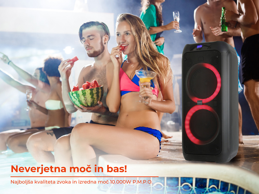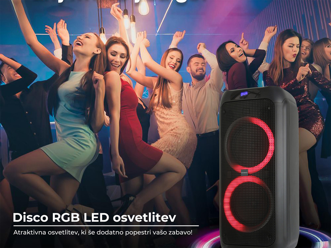 Equalizer na kontrolni plošči bo poskrbel za optimalno nastavitev zvoka, vgrajene Disco LED RGB lučke pa zagotavljajo nepozabno in unikatno vzdušje ter neskončno zabavo. Poleg vsega ima SPK5310 PRO vgrajen tudi kvaliteten Radio FM tuner, kar pomeni, da lahko vedno poslušate tudi vašo najljubšo radijsko postajo.