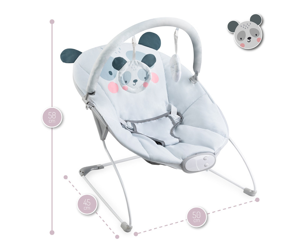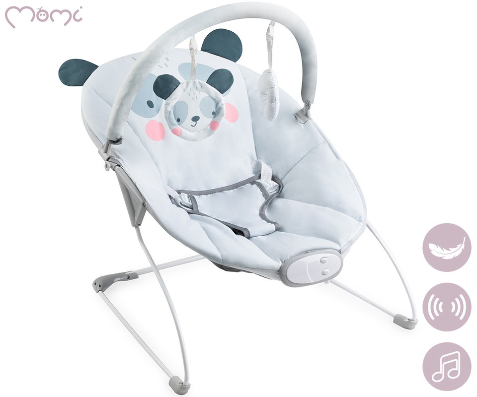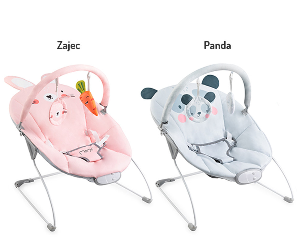 Gugalnik MoMi GLOSSY ime edinstven dizajn. Lahko izbirate med sivo barvo s prikupno pando in roza barvo z ljubkim zajčkom. Dojenčku sta na dosegu 2 senzorični igrači – ogledalo in ropotuljica, s katerima se lahko zamoti. Igrače je možno tudi sneti, da jih dojenček lahko uporablja samostojno.