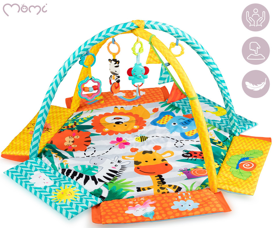 Zahvaljujoč živim barvam, različnim teksturam in senzoričnim igračam, MoMi MULTI stimulira čute in otroke spodbuja k igri. Dvignjene stranice igralne podloge, pa pomagajo ustvariti udoben in varen suh bazen.