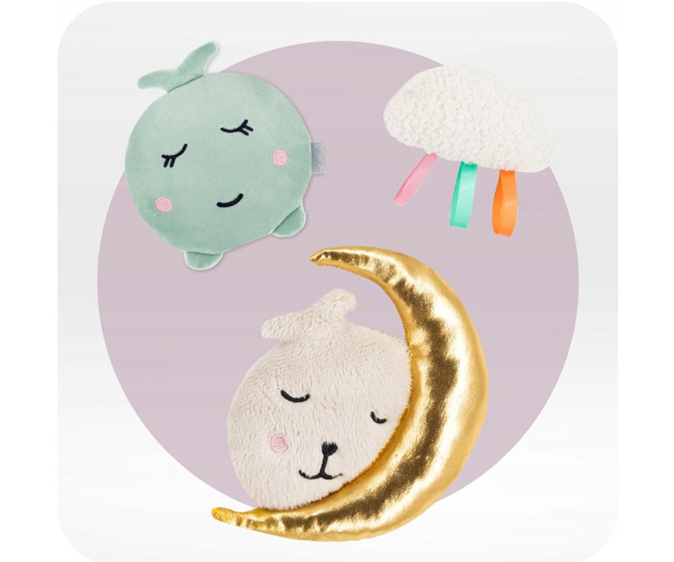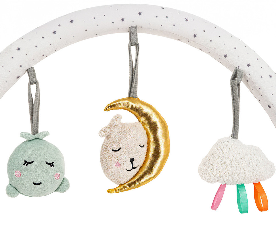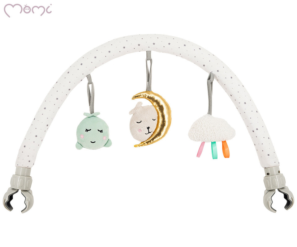 Igralni lok je opremljen s tremi plišastimi igračami, ki bodo zagotovo zanimale vašega otroka – ropotuljico v obliki oblaka, ogledalcem MoMi in piskačem MoMi z luno. Vsi elementi so izdelani iz visokokakovostnih, mehkih in prijetnih na dotik tkanin. Poleg tega je mogoče vsako igračo enostavno sneti in uporabljati ločeno, brez potrebe po nameščanju na igralno palico.